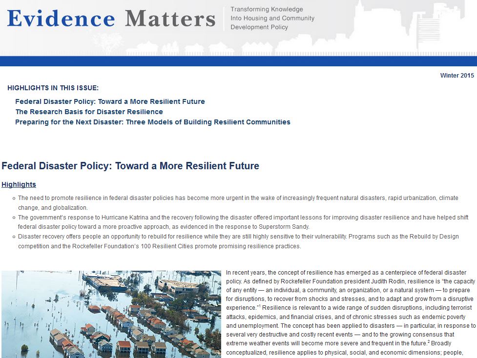 The research presented in my book, Local Disaster Resilience, has been included in a recent HUD publication titled “Federal Disaster Policy: Toward a More Resilient Future.” Check it out here: http://www.huduser.org/portal/periodicals/em/winter15/highlight1.html The article focuses on the incorporation of resilience into disaster policy by the federal government and how it is affecting regional, local, and individual levels.